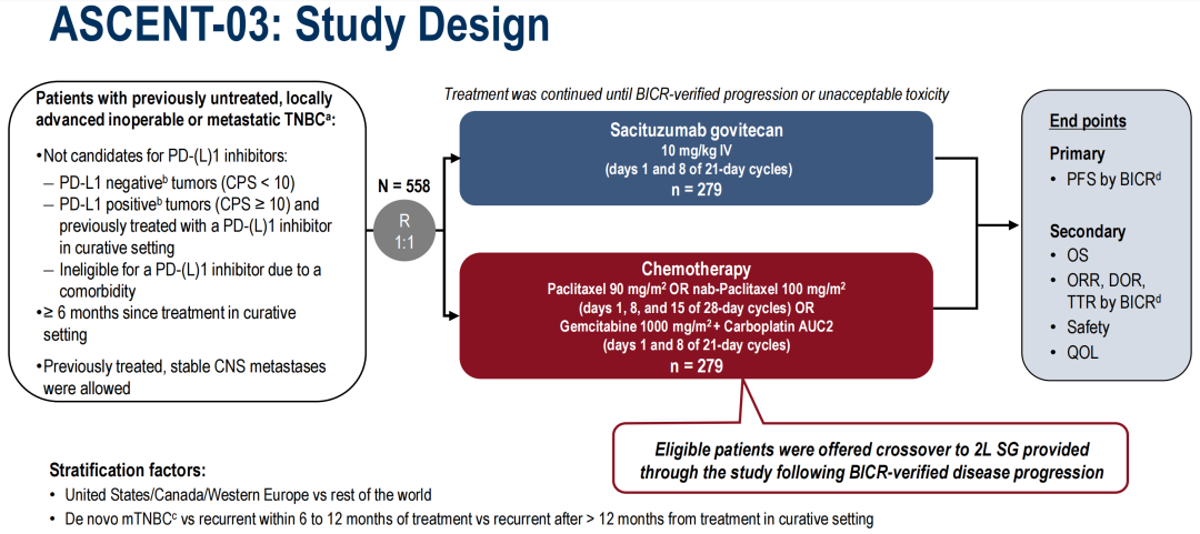 徐兵河教授:ASCENT-03是一项全球多中心III期临床试验,旨在探讨单药SG用于不适合免疫治疗的未经治mTNBC的疗效和安全性。不适合免疫治疗的患者包括:PD-L1阴性(CPS<10),PD-L1阳性(CPS≥10)且既往接受过PD-(L)1抑制剂早期治疗,以及由于其他合并症而无法耐受PD-(L)1抑制剂。入组患者随机(1:1)接受SG单药(10 mg,D1/8,q3W)或化疗(紫杉醇或白蛋白紫杉醇或吉西他滨+卡铂),化疗组经BICR确认疾病进展且符合条件的患者可二线接受SG治疗。研究的主要终点是独立盲法中心评审(BICR)的无进展生存期(PFS),次要终点包括总生存期(OS)、客观缓解率(ORR)、安全性等。研究设计及入组患者基线特征如下图所示。