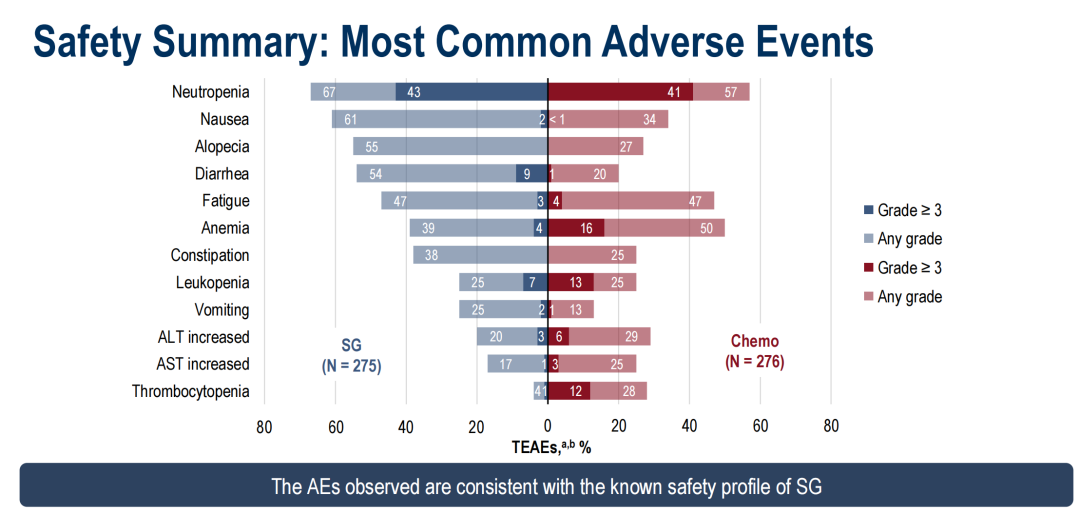 在安全性方面,SG组的中位暴露时间长于化疗组(SG、紫杉类、GC:8.3 vs 6.3 vs 5.8个月),≥3级的治疗期间不良事件(TEAEs)与化疗组相当(66%vs 62%),但停药率仅为化疗组的三分之一(4%vs 12%),导致减量的不良事件发生率也低于化疗组(37%vs 45%)。SG组的常见≥3级不良事件以中性粒细胞减少(43%vs 41%)和腹泻(9%vs 1%)为主。这些安全性数据表明SG作为一线治疗方案良好的治疗耐受性,常见不良事件仍为临床易于管理的骨髓抑制和胃肠道反应。