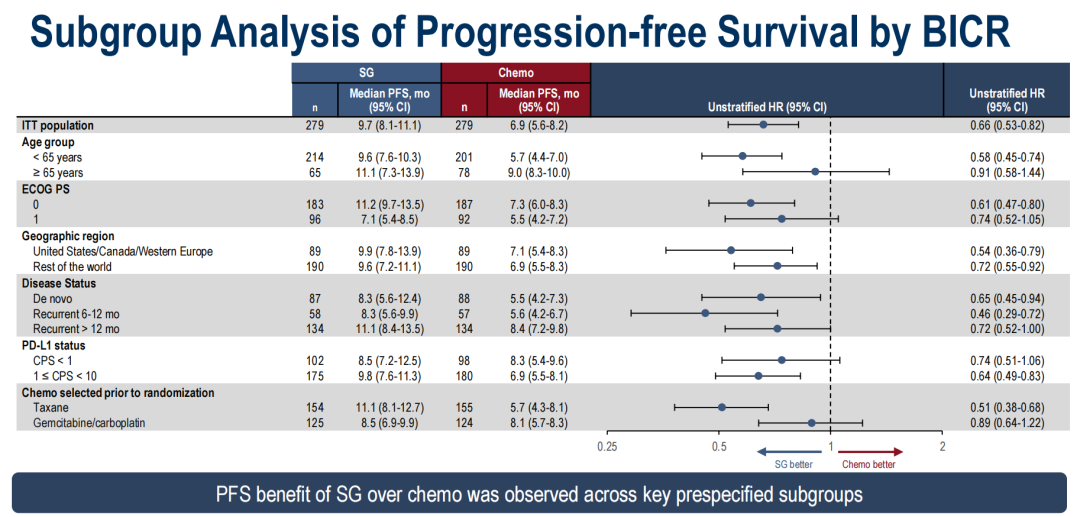 研究结果显示达到了主要终点,BICR评估SG组的中位PFS相较于化疗组延长2.8个月,疾病进展或死亡风险显著降低38%(9.7 vs 6.9个月,HR 0.62,95%CI:0.50-0.77,P<0.0001);研究者评估的PFS获益表现一致(9.6 vs 6.8个月,HR 0.64,95%CI:0.52-0.79)。此外,在各个亚组均呈现一致的获益趋势。