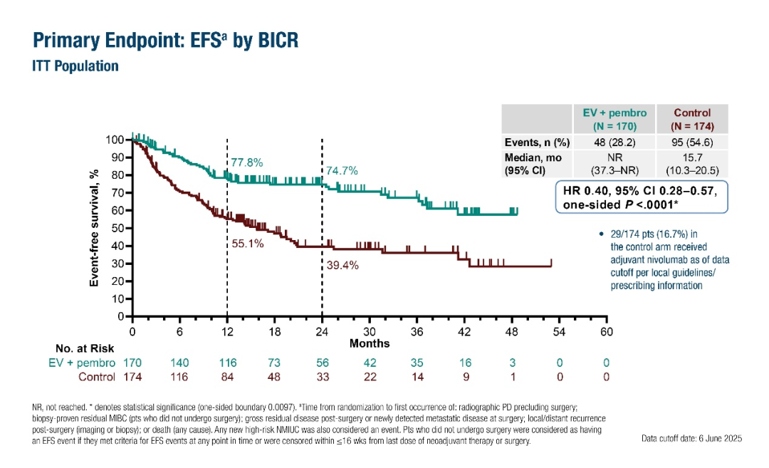 编者按:近年来,肌层浸润性膀胱癌(MIBC)的治疗策略取得了重要进展,尤其是免疫检查点抑制剂、靶向治疗、抗体偶联药物等新型疗法拓展了应用范围,有望进一步满足这类患者的保膀胱需求。在近期举行的欧洲肿瘤内科学会年会(ESMO 2025)上,KEYNOTE-905/EV-303研究分析了抗体偶联药物与免疫疗法联合应用的疗效:结果显示,维恩妥尤单抗联合帕博利珠单抗的围术期治疗,在无事件生存期(EFS)和总生存期(OS)方面均表现出统计学显著且具有临床意义的改善。