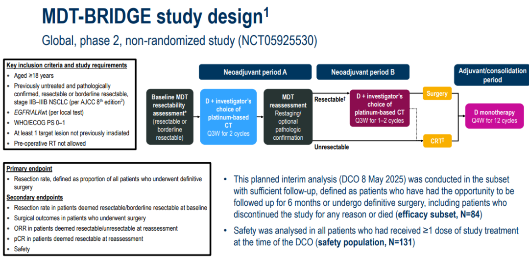 全球性、前瞻性研究MDT-BRIDGE旨在评估可切除及临界可切除IIB–IIIB期非小细胞肺癌(NSCLC)患者围手术期使用度伐利尤单抗联合铂类化疗的效果。该研究整合了实时多学科团队(MDT)决策,以指导通过手术或根治性放化疗后度伐利尤单抗巩固治疗来实现根治性治疗。