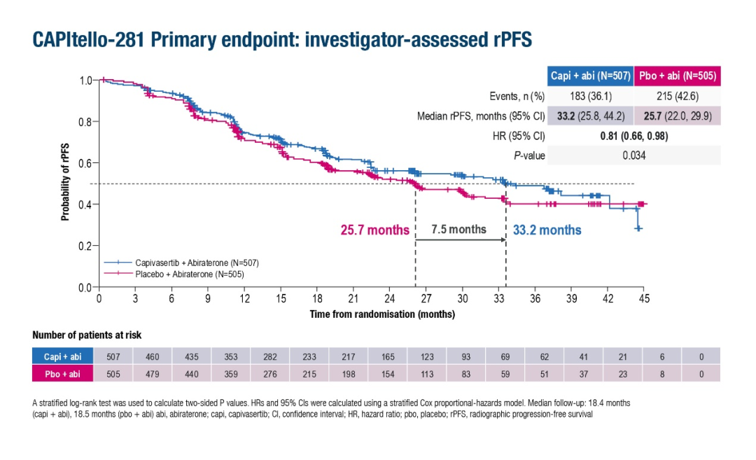 △CAPItello-281试验中卡匹色替联合阿比特龙治疗组的rPFS显著改善