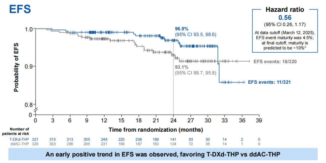 此外,T-DXd-THP组早期数据(24个月)也显示出积极的EFS获益趋势(HR=0.56),预示着pCR的获益有望转化为长期的生存改善。