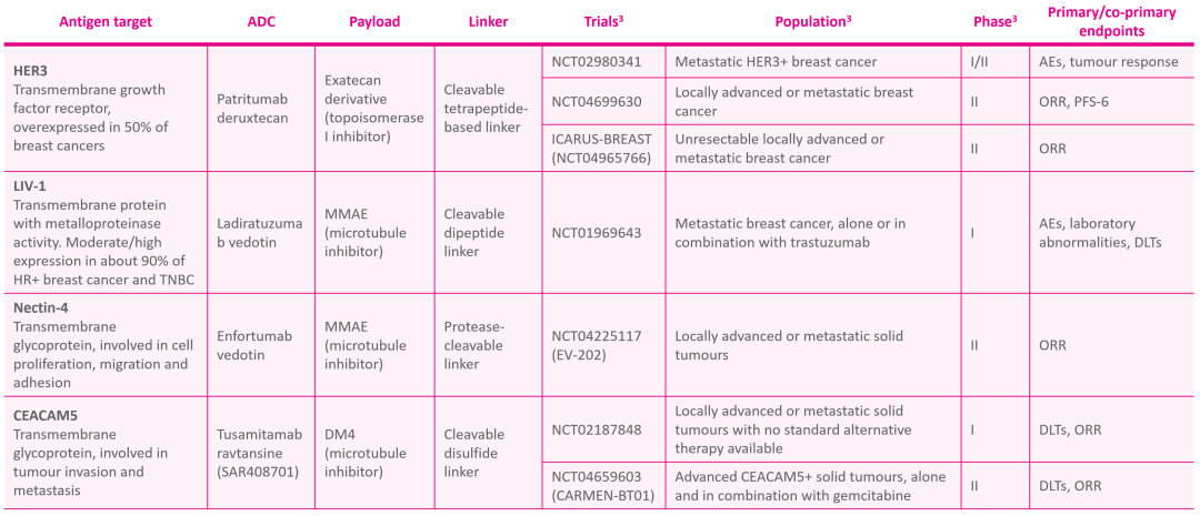 除广泛适用于TNBC的Trop-2 ADC外,HER2靶向的ADC及HER3、LIV-1、Nectin-4、CEACAM5等新型ADC正在探索和开发中,预示TNBC治疗将迎来更多创新选择。