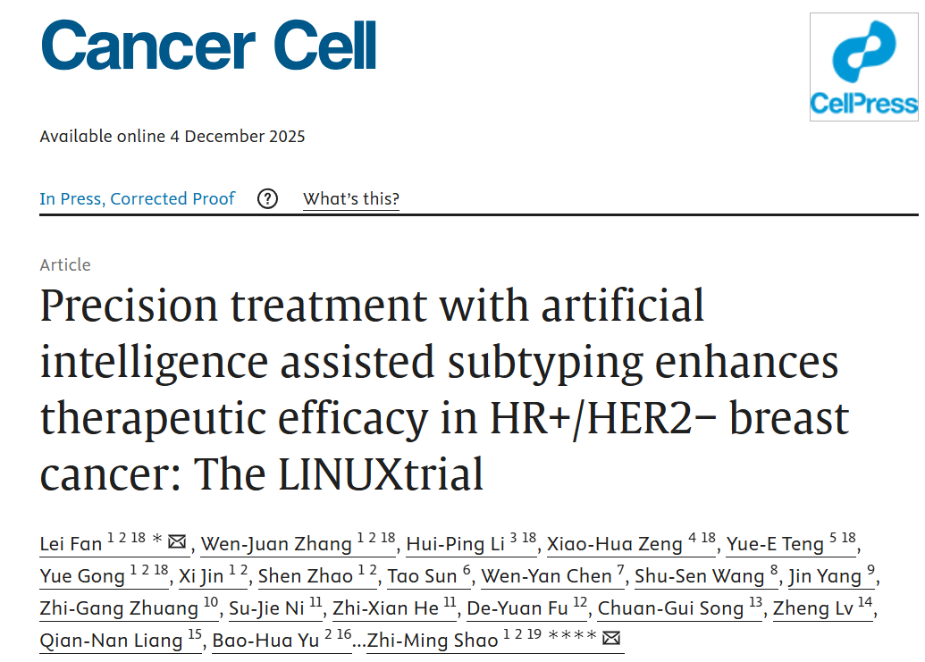 Lei Fan,Wen-Juan Zhang,Hui-Ping Li,et al.Precision treatment with artificial intelligence assisted subtyping enhances therapeutic efficacy in HR+/HER2−breast cancer:The LINUXtrial.Cancer Cell,2025.https://doi.org/10.1016/j.ccell.2025.11.003.