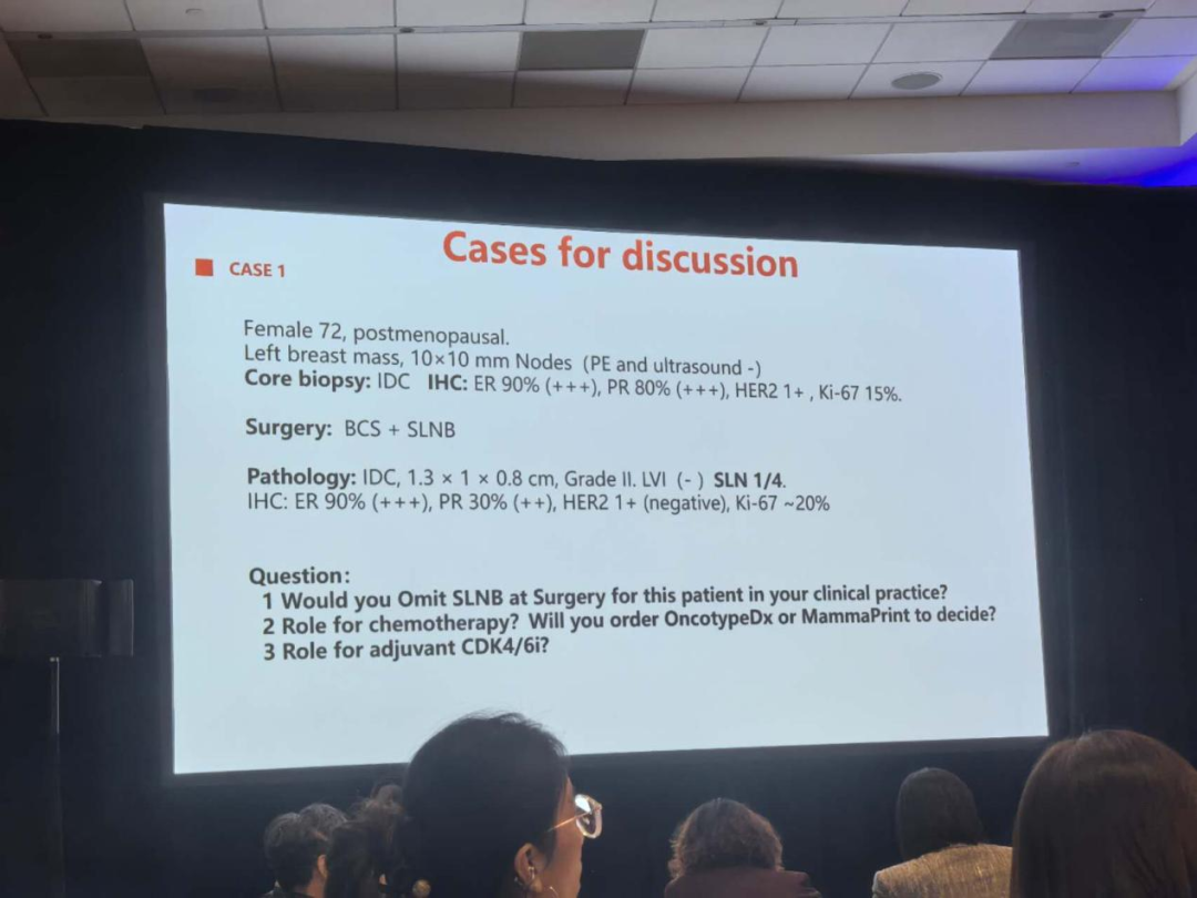 针对一位72岁、肿瘤仅1厘米、腋窝影像学阴性的低危绝经后患者,讨论焦点首先集中于“前哨淋巴结活检(SLNB)能否安全豁免”。尽管SOUND、INSEMA等最新研究为豁免提供了循证依据,但各国专家的临床实践仍反映出基于医疗体系与文化差异的不同考量。Michael Gnant教授指出,虽然指南允许,但在临床中仍持谨慎态度,并强调高质量腋窝超声是决策前提。Harold Burstein教授分享了美国实践的快速转变,指出在满足特定条件时,许多中心已将“不进行SLNB”作为默认选项,并分析了指南在确保治疗可及性(如医保覆盖)与纯粹临床推荐之间的微妙平衡。吴炅教授阐明了中国目前更为普遍的做法:仍会进行SLNB。他解释,这背后既有术前诊断信息(如完整分子分型)获取程度的现实因素,也体现了将腋窝分期视为影响全身性辅助治疗决策的理念。这一差异生动体现了在“手术降级”全球趋势下,不同地区对“分期信息价值”的权衡。