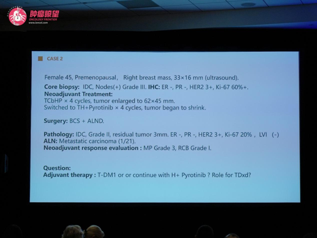 第二个病例涉及一位45岁HER2阳性乳腺癌患者,其在接受标准新辅助治疗方案(TCHP)期间出现原发性肿瘤进展,换用“曲妥珠单抗+吡咯替尼”后显著退缩,但术后仍残留微小病灶及一枚阳性淋巴结。此病例引发了关于辅助治疗升级选择的热烈讨论。Virginia Kaklamani教授表示,基于KATHERINE研究的坚实证据,将辅助治疗换用T-DM1是国际专家公认的标准选择。而随着DESTINY-Breast05等研究数据的公布,T-DXd因其在高危HER2阳性乳腺癌辅助治疗中显示的卓越潜力,被多位专家视为未来更具优势的选择。吴炅教授分享了中国的临床实践与思考,指出在当前阶段,T-DM1仍是中国患者的标准推荐之一,同时强调治疗选择常受医保政策与肿瘤负荷评估的影响。讨论中,专家们也对中国患者群体大、疾病特征鲜明等特点表示认可,认为这为开展优化局部治疗强度的大规模临床试验提供了独特机遇。