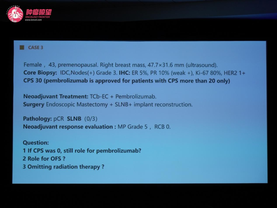 第三个病例为一位43岁绝经前患者,在接受含免疫检查点抑制剂的新辅助治疗后达到病理完全缓解(pCR)。讨论围绕三个核心问题展开:若CPS评分为0是否仍需使用帕博利珠单抗、是否需要卵巢功能抑制(OFS)、以及能否豁免放疗。专家们指出,尽管本例患者CPS高达30符合当前用药门槛,但争议仍延伸至生物标志物阈值本身的合理性及其对临床应用的限制。关于放疗豁免,多位专家强调,即使达到pCR,尤其对于初始肿瘤负荷较高的患者,仍需审慎评估局部复发风险。Michael Gnant与Harold Burstein教授均指出,对于新辅助治疗后达到pCR的患者,其局部区域风险是否已充分降低、从而可安全地降级或省略放疗,仍是一个重要的未解问题。他们认为,中国庞大的患者群体为开展此类去强化治疗研究提供了独特优势。吴炅教授则强调,虽然研究提示pCR获益并不完全依赖CPS评分,但当前临床实践仍需综合循证证据、药品规范与医保政策做出决策。