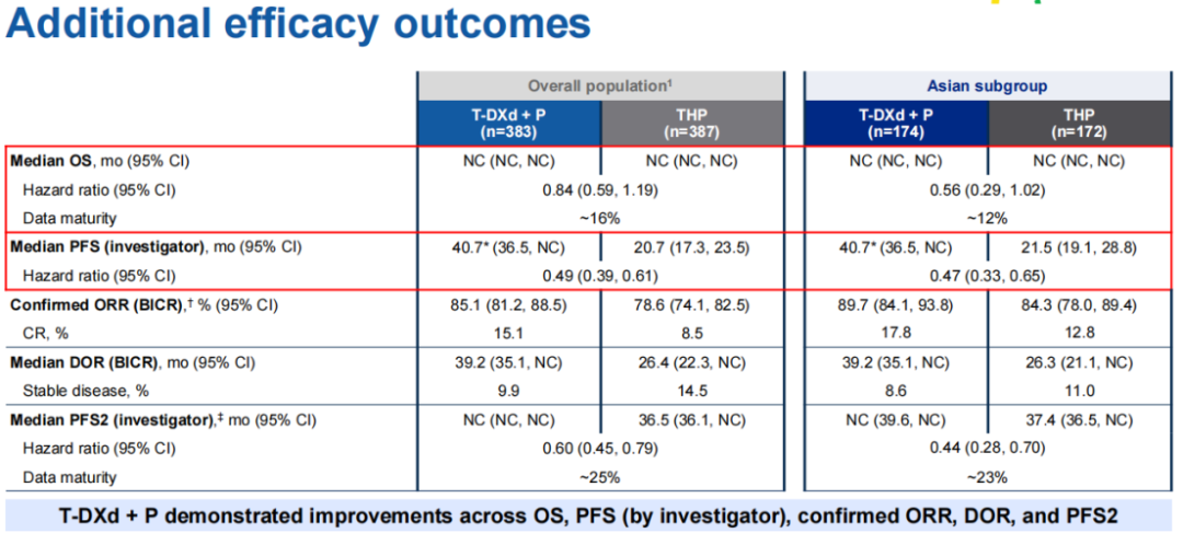 而在次要疗效终点方面,T-DXd+P组治疗客观缓解率(ORR)为89.7%,其中完全缓解(CR)率为17.8%,两项数据均高于THP组(84.3%/12.8%),且T-DXd+P组患者中位缓解持续时间(mDOR)长达39.2个月,较THP组延长mDOR超过1年(26.3个月);此外,T-DXd+P组中位PFS2、OS随访至今均仍未达到,但已呈现早期获益趋势,且风险比(HR)值均低于全球人群分析现有结果。