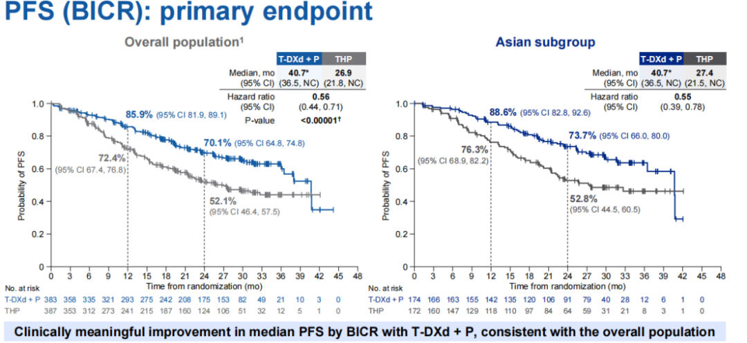 分析数据显示,T-DXd+P组和THP组亚洲患者由盲态独立中心评估(BICR)的mPFS为40.7个月和27.4个月,两组24个月PFS率为73.7%vs.52.8%,T-DXd+P方案使患者疾病进展或死亡风险显著下降45%(HR 0.55,95%CI:0.39-0.78);上述数据显示,T-DXd+P方案在亚洲人群中的治疗获益与中国人群保持一致,并在数值上略优于研究全球人群。