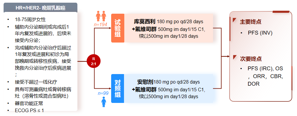 该研究主要纳入我国内分泌经治后进展、且接受不超过1线化疗的HR+/HER2-晚期乳腺癌患者,按2:1随机分组,分别予以库莫西利联合氟维司群(n=194)或安慰剂联合氟维司群(n=99),主要终点为研究者(INV)评估的PFS,次要终点为独立影像(IRC)评估的PFS、总生存期(OS)、客观缓解率(ORR)、临床获益率(CBR)、缓解持续时间(DOR)。