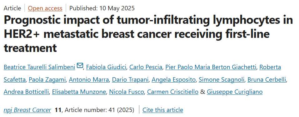 [1].Taurelli Salimbeni B,Giudici F,Pescia C,et al.Prognostic impact of tumor-infiltrating lymphocytes in HER2+metastatic breast cancer receiving first-line treatment[J].npj Breast Cancer,2025,11(1):41.