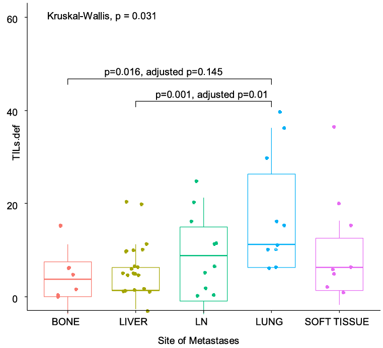 此外,评估TIL的转移部位与TIL水平相关。肺转移的TIL水平高于肝转移(中位数:15%vs 5%,未调整P值<0.001,调整P=0.01)。骨转移亚组也观察到了类似趋势(中位TIL:15%vs 7.5%,调整后P=0.145和未调整后P=0.016)。