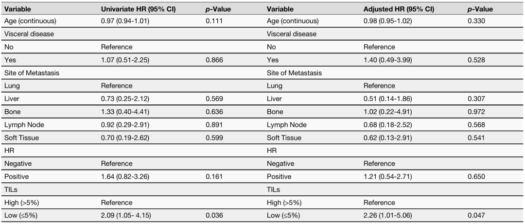 研究者检验了TIL水平与PFS之间的相关性,并校正了年龄、累及内脏、HR状态和TIL评估部位等临床变量。单变量分析显示,TIL水平较低与PFS较差相关(HR=1.74,P=0.024)。校正上述临床变量后,这种关联仍然显著(HR=1.77,P=0.024)。当将TIL视为连续变量(每10%增量)时,TIL水平较高与更好的预后相关,但统计学上并不显著。