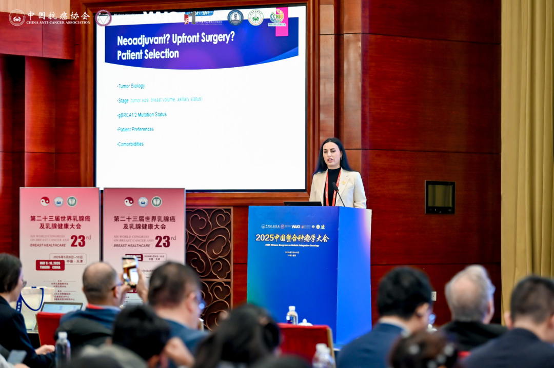 随后,Hagigat Valiyeva Qanimat教授以《定义乳腺癌管理的第一步:新辅助化疗还是前期手术?》为题,形象地提出治疗应像“裁缝”一样量体裁衣。她详细梳理了不同分子分型的治疗路径:对于三阴性(TNBC)和HER2阳性患者,若肿瘤大于1.5cm或淋巴结阳性,新辅助化疗(NAC)是标准选择,旨在追求pCR以改善预后;而对于Luminal A型或低危Luminal B型,前期手术仍是首选。Valiyeva教授还重点阐述了腋窝处理的变革,引用Z0011、AMAROS及SENOMAC等研究,提出了“停止对腋窝的过度追逐(Stop Chasing the Axilla)”的观点,指出即使是前哨淋巴结有1-2枚宏转移的患者,在特定条件下也可免除腋窝清扫,从而显著降低上肢水肿等并发症。