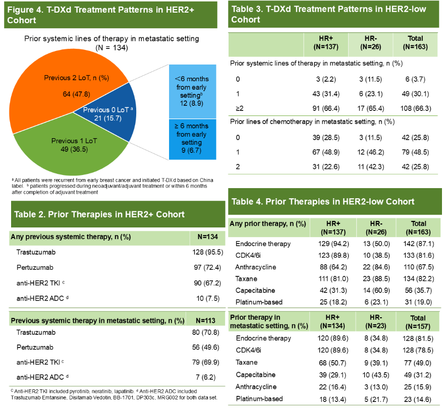 研究还分析了T-DXd在真实世界中的治疗模式(treatment patterns):在HER2阳性队列中,T-DXd主要用作二线及三线治疗,同时也被用于辅助治疗后疾病进展患者的一线治疗,此类患者占比为15.7%;HER2阳性队列患者95.5%接受过曲妥珠单抗治疗,72.4%接受过帕妥珠单抗治疗,67.2%接受过吡咯替尼等HER2-TKI治疗。