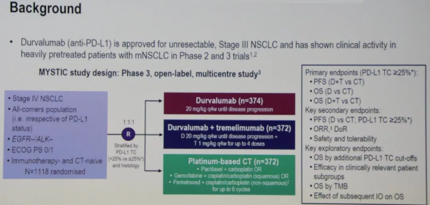 [1]B.C. Cho, et al. Efficacy and safety of first-line durvalumab (D) ± tremelimumab (T) vs platinum-based chemotherapy (CT) based on clinical characteristics in patients with metastatic (m) NSCLC: results from MYSTIC. Abstract LBA3, Presented at ELCC Annual Meeting; April 10-13, 2019; Geneva.