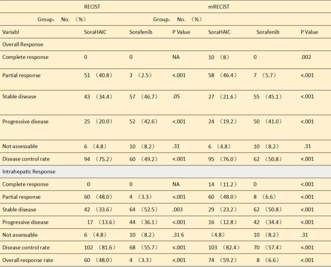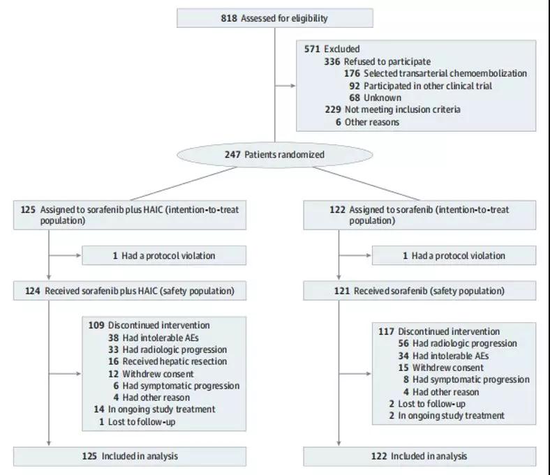 本研究在2016年4月1日至2017年10月10日期间共纳入中国5家医院的818例患者,其中有247例肝细胞癌门静脉侵犯的患者入组本次研究并进行为期10个月的随访,其中男性患者223例,女性患者24例,年龄在18-75岁,中位年龄为49岁。通过计算机序列随机对这些患者进行分配(1:1)以接受400mg索拉非尼每日2次(Sorafenib组)或400mg索拉非尼每日2次加HAIC(SoraHAIC组)(奥沙利铂85mg/m2,亚叶酸钙400mg/m2,第一天氟尿嘧啶400mg/m2,氟尿嘧啶输注2400mg/m2,持续46小时,每3周)。研究的主要终点是患者的总生存期(OS)。在接受至少1剂研究治疗的患者中评估治疗安全性。