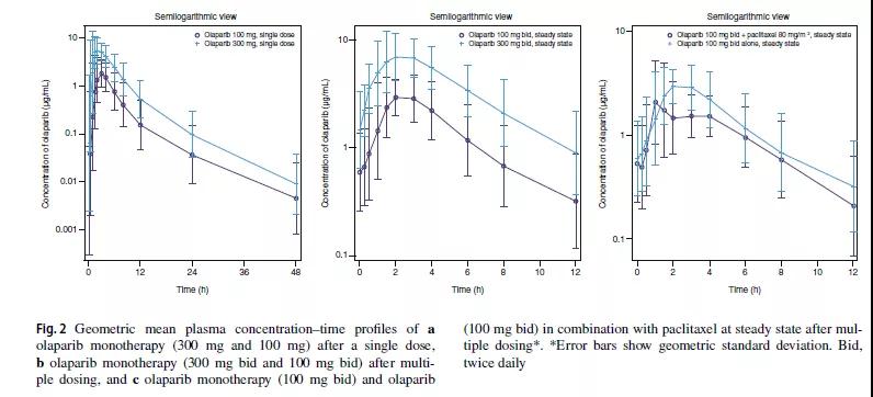 结果显示奥拉帕利在中国人群的药代动力学参数与国际研究人群(西方和日本人群)基本一致,中国患者单次给药的中位达峰时间tmax分别为100mg  1.95h,300mg 1.50h,西方人群分别为1.03h 和1.49h,日本人群300mg单次给药为1.98h。中国患者多次给药中位达峰时间tmax分别为100mg bid 2.00h,300mg bid 1.50h,相应的西方人群和日本人群300mg bid为1.5h和3.0h,结果显示PK结果与种族、性别、年龄或体重不显著相关。血药浓度峰值Cmax,中国人群单次给药100mg和300mg 分别为2.97和6.88ug/ml,持续给药(bid)则分别为3.75 和8.27 μg/ml;西方人群300mg bid单药或持续给药Cmax分别为9.17 μg/ml和 8.44 μg/ml。所以根据国人和西方人群基本一致的药代动力学曲线,该研究推荐国人可应用300mg bid的奥拉帕利片剂单药进行下一步临床研究,无需改变应用剂量。
