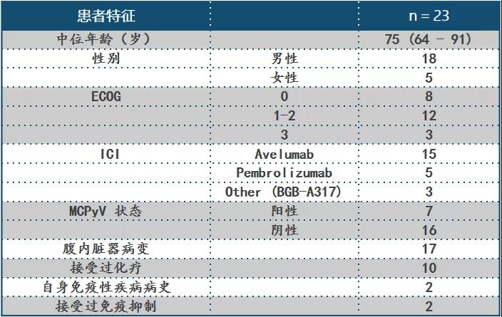 中位起效时间为8周,12个月无进展生存率为39%。年龄小于75岁的患者(80%vs.46%),基线LDH正常的患者(71%vs.50%),发生免疫相关不良事件的患者(100%vs.47%),以及MCPyV阴性患者(69%vs.43%)客观缓解率更高。能够达到完全代谢缓解的患者基线接受FDG-PEG扫描时肿瘤体积更小(完全代谢缓解肿瘤:35.7mL,未完全代谢缓解肿瘤:187.8mL)。