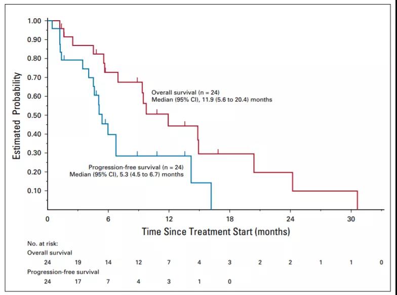 结果:2015年6月至2017年3月,24例符合入组条件接受了治疗,中位年龄73岁(62~88岁)。ECOG PS评分0分、1分和2分者分别有11例、11例和2例。病灶分布部位及数量:淋巴结16处,肺9处,肝7处,膀胱5处,骨2处。治疗周期中位数为4个(1~16个)。12例经确认获得缓解,观察到的客观缓解率为50%。中位总生存期为11.9个月(95%CI:5.6~20.4),中位无进展生存期为5.3个月(95%CI:4.5~6.7)。