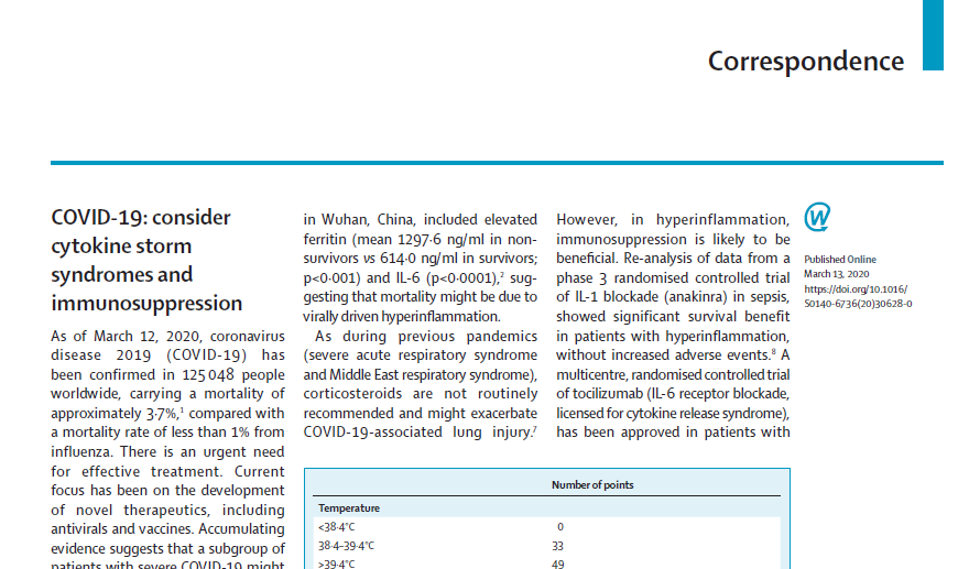 3月28日,著名医学杂志《柳叶刀》发表了来自英国伦敦大学医学院Jessica J. Manson教授团队的一例COVID-19重症病例的报道。该例患者出现了严重的CRS,研究者结合临床上应用Tocilizumab治疗因CAR-T治疗引起的重症CRS,在该重症病例上尝试应用Tocilizumab治疗,并获得了明显的临床恢复。本刊特邀请我国著名血液病专家马军教授对该项报道进行了一线解读。
