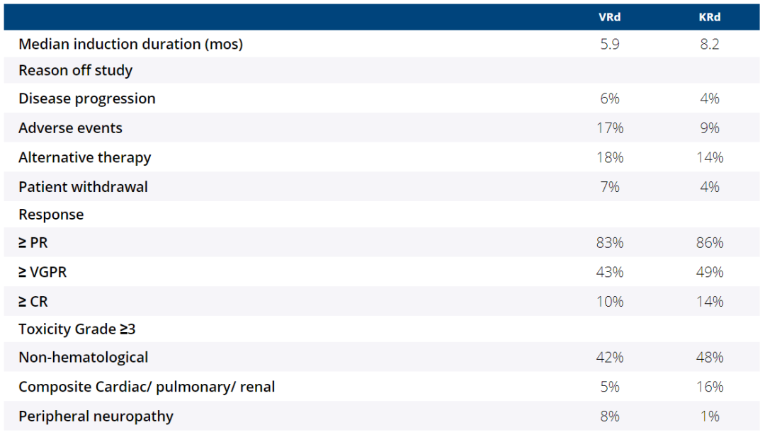 结论:在这项3期随机试验中,KRd与VRd相比在NDMM中没有改善PFS。KRd组的心肺和肾毒性发生率明显高于VRd组,而神经病变发生率明显高于VRd组。VRd仍然是标准和中等风险NDMM的标准三重诱导方案,并且是4药联合方案的主干。