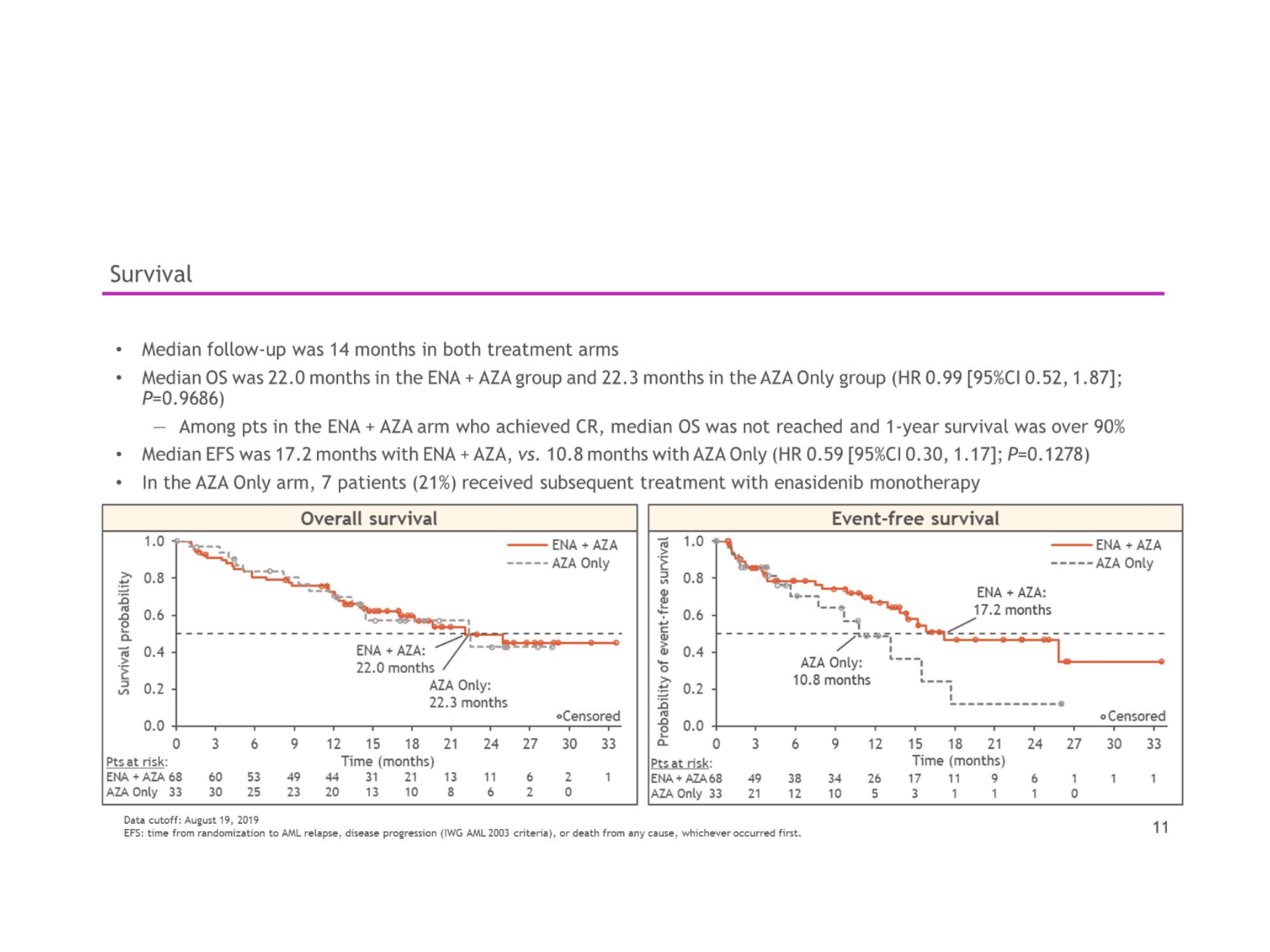 结论:ENA联合AZA能够显著改善mIDH2 ND-AML患者的治疗反应以及反应持续时间,并且在老年患者中耐受性良好。后续治疗对OS和EFS以及新转化数据的影响将在会议中呈现。(临床试验注册号:NCT02677922)。