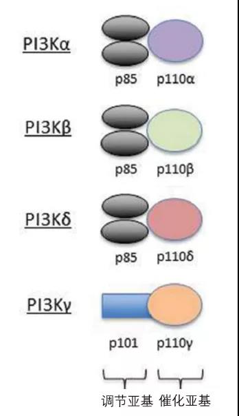 PI3Ks属于异二聚体激酶家族,由一个催化亚基和一个调节亚基组成。目前PI3Ks分为三类(Ⅰ类、Ⅱ类和Ⅲ类),其生理机制各不相同,而Ⅰ类是与人类癌症关系最密切的一类。Ⅰ类PI3Ks包括PI3Kα、PI3Kß、PI3Kδ和PI3Kγ四个亚型,调节亚基为p85和p101,而催化亚基分别为p110α,β,δ,γ(图1)[2]。而不同的Ⅰ类PI3Ks亚型在不同组织细胞的表达具有显著差异,PI3Kα和β广泛表达在各类组织细胞中,而PI3Kδ和PI3Kγ主要在造血细胞中表达[3]。其中,PI3Kα通过胰岛素生长因子(IGF)受体参与葡萄糖代谢[4],而PI3Kβ是血小板粘附和聚集的重要信号分子[5]。PI3Kδ可被B细胞受体(BCR)激活,是调节正常以及恶性B淋巴细胞的发育、分化和激活的关键分子[6, 7]。而PI3Kγ在肿瘤相关巨噬细胞中表达,巨噬细胞的PI3Kγ信号通过抑制抗肿瘤T细胞的激活促进免疫抑制,从而促进肿瘤生长[8]