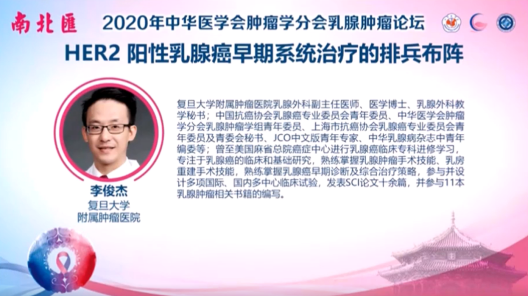 众所周知,对于早期乳腺癌患者来说,治愈是其最终目标。目前,HER2阳性早期乳腺癌的新辅助和辅助治疗方案众多,医生的选择也不尽相同。为进一步探讨更为优化的治疗策略,2020年“南北汇”上,李俊杰教授带来了“HER2阳性早期乳腺癌系统治疗的排兵布阵”的报告。在袁芃教授的主持下,多位专家齐聚云端,围绕该话题进行了讨论。