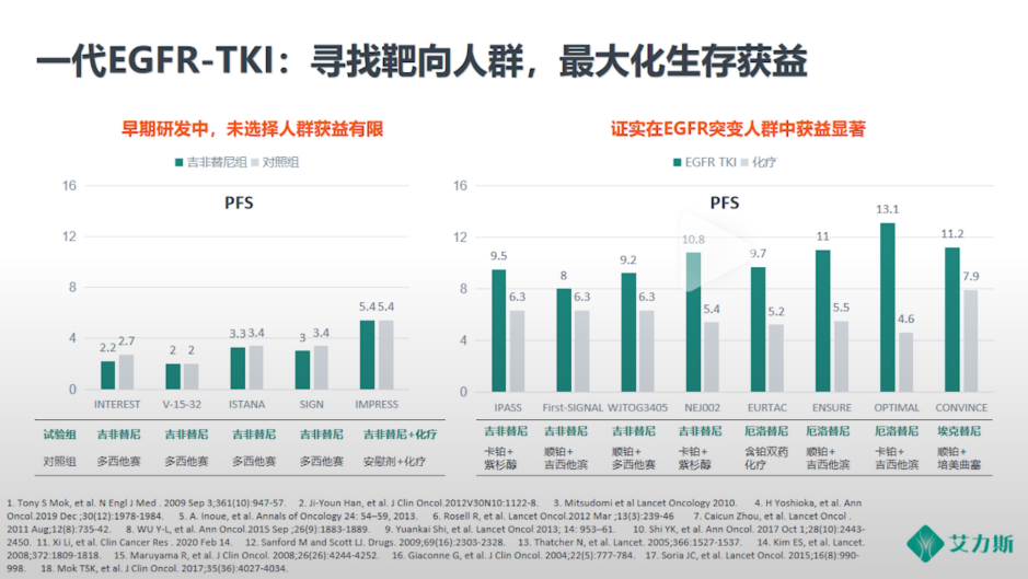 相较于欧美人群,EGFR突变是中国肺癌最常见的驱动基因,几乎占到一半,所以EGFR TKI的探索与应用至关重要。在精准治疗时代以前,对于未筛选的肺癌患者,一代EGFR TKI获益有限,PFS仅3个月左右;随着EGFR突变人群筛选的应用,精准治疗时代真正开启,一代EGFR TKI对此类人群的PFS获益提高到接近1年。