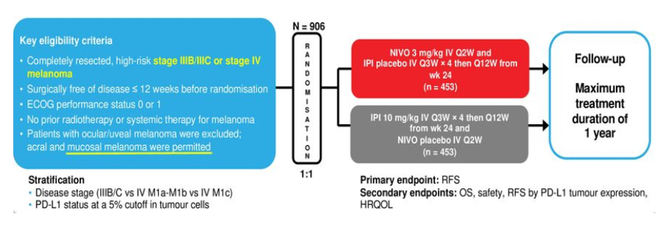 CheckMate 238研究是一项对比纳武利尤单抗(NIVO)和伊匹木单抗(IPI)在黑色素瘤辅助治疗中疗效和安全性的国际Ⅲ期研究,将年龄≥15岁且完全切除ⅢB/C或Ⅳ期黑色素瘤的患者按分期和PD-L1状态进行分层,并按1:1随机分配至NIVO组(3mg/kg Q2W;n=453)或IPI组(10mg/kg Q3W,4次给药,Q12W;n=453),治疗≤1y或直到疾病复发/毒性不可耐受。主要终点是RFS。次要终点包括OS和安全性以及DMFS探索性分析。