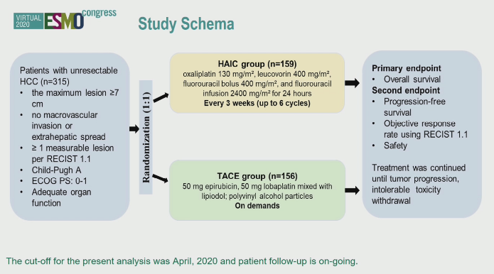 方法:将肿瘤直径≥7cm,无大血管侵犯或肝外转移的原发不可切除肝癌患者按1:1随机分至FOLFOX方案(奥沙利铂130mg/m2,亚叶酸钙400mg/m2,氟尿嘧啶400mg/m2+持续24h静注氟尿嘧啶2400mg/m2,Q3W,最多6个周期)HAIC组或TACE(表柔比星50mg,洛铂50mg,碘化油乳化剂+聚乙烯醇颗粒,研究者视疗效决定是否重复治疗)组。研究主要终点为总生存期(OS),次要终点为无进展生存期(PFS)和安全性。
