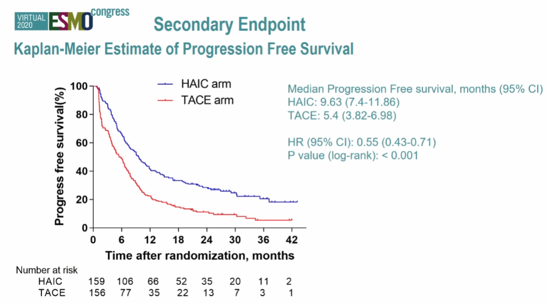 结果:315例患者被随机分至HAIC组(n=159)或TACE组(n=156),至2020年4月本次分析数据截止时,HAIC组中位OS为23.1个月,TACE组为16.07个月,HAIC较TACE显著延长中位OS(HR 0.58[95% CI, 0.45−0.75],P<0.001)、客观缓解率(RECIST: 45.9 [73] vs. 17.9% [28], P <0.001; mRECIST: 48.4 [77] vs. 32.7% [51], P=0.004)和中位PFS(9.63个月 vs. 5.40个月,HR=0.55[95% CI, 0.43−0.71],P<0.001)。HAIC组23.8%患者(38例)肿瘤缩小之后成功实施根治性切除术,显著多于TACE组的11.5%(18例,P=0.004)。TACE组47例患者(30%)、HAIC组30例患者(19%)发生治疗相关严重不良事件,且各有2例患者因治疗死亡。两组患者多数接受靶向、消融、免疫等后续治疗。