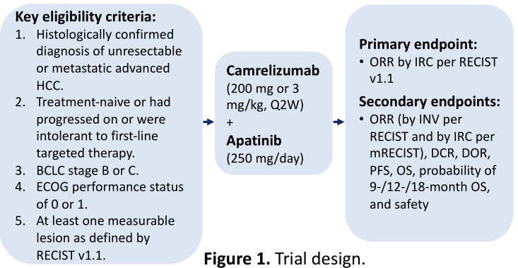 方法:研究在中国25个中心纳入未接受一线靶向治疗,或一线治疗不耐受/难治的进展期肝癌患者,患者均接受卡瑞利珠单抗+阿帕替尼治疗(卡瑞利珠单抗200mg或3mg/kg, Q2W, 阿帕替尼250mg/d)。主要终点是独立评审委员会(IRC)评估的客观缓解率(ORR)。