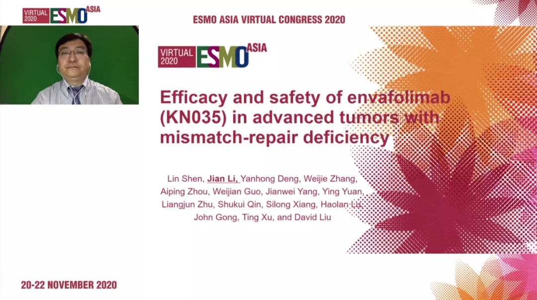 70MO – Shen L, Li J, Deng Y, et al. Efficacy and safety of envafolimab (KN035) in advanced tumors with mismatch-repair deficiency. ESMO Asia Virtual Congress 2020 (20-22 November 2020).