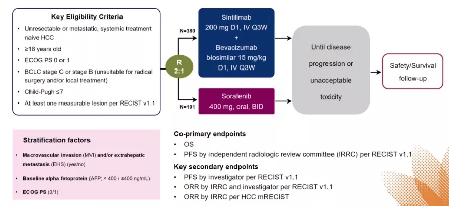 ORIENT-32研究纳入不可切除或转移性HCC患者,均为初次接受系统性肝癌治疗。在Ⅲ期研究中,按照2:1的随机分组,380例患者接受信迪利单抗(200 mg,每3周一次静脉注射)+贝伐珠单抗(15 mg/kg,静脉注射,每3周一次)治疗,191例患者接受索拉非尼(400 mg,2次/日)治疗。分层因素包括大血管浸润和/或肝外转移(是否存在)、基线甲胎蛋白水平(<400和≥400 ng/ml)和ECOG体能状态(0和1)。