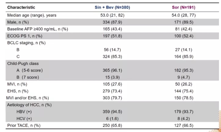 纳入研究的患者数据截至2020年8月15日,基线特征非常平衡,其中94.2%的患者有乙型肝炎感染,4.2%的患者有慢性丙型肝炎Child-Pugh B级(图2)。