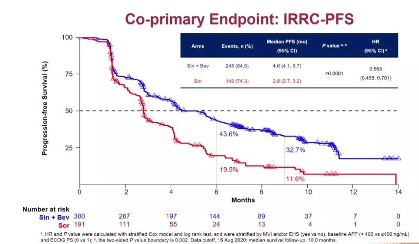 同样,改善的PFS也得到了证实,按照RECIST v1.1标准经IRRC评估的进展风险在联合治疗组降低了43.5%;联合治疗组的平均PFS为4.6个月,索拉非尼组平均PFS为2.8个月(HR=0.565;95%CI:0.455~0.701;P<0.0001)(图4)。