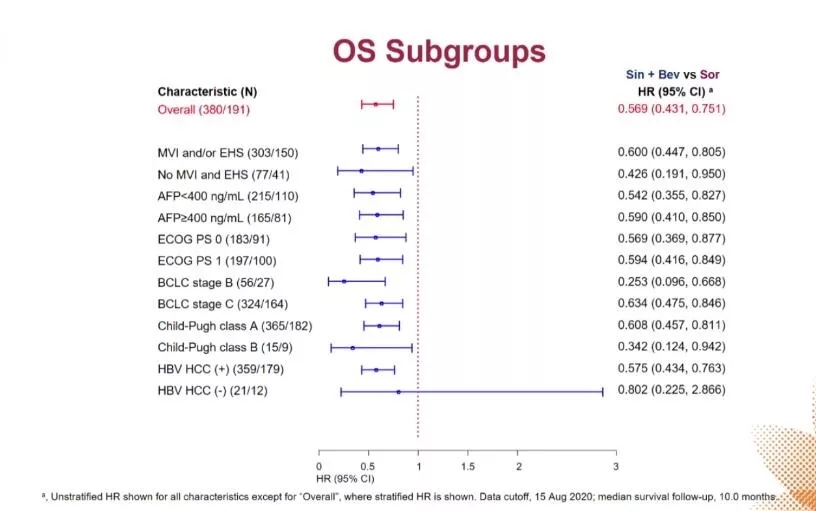 中位随访时间为10.0个月,与索拉非尼相比,使用信迪利单抗和贝伐珠单抗联合治疗中位OS显著延长,并且联合治疗组降低了43.1%的全因死亡风险;中位OS分别为不可估计(NE)和10.4个月(危险比[HR]:0.569;95%置信区间[CI]:0.431~0.751;P<0.0001)(图3)。