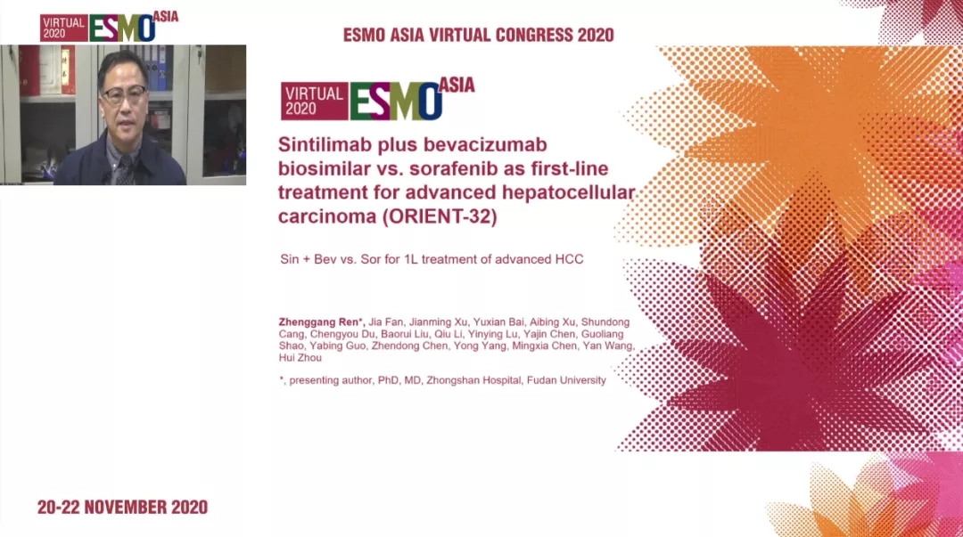 11月21日,在2020年ESMO Asia虚拟大会上,复旦大学附属中山医院樊嘉院士牵头的研究Ⅱ/Ⅲ期ORIENT-32 (NCT03794440)入选大会的LBA,作为该研究的第一作者,任正刚教授进行口头报告,分享了该研究Ⅲ期疗效部分的数据:与索拉非尼治疗相比,信迪利单抗联合贝伐珠单抗一线治疗晚期肝细胞肝癌(HCC)显著提高生存。