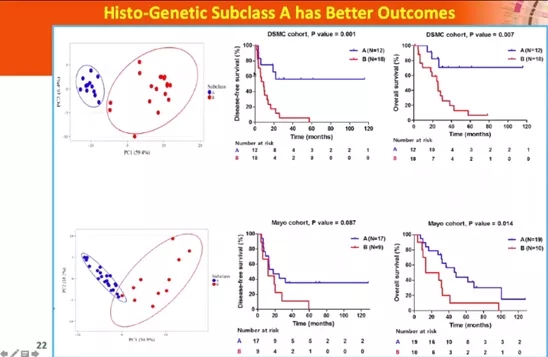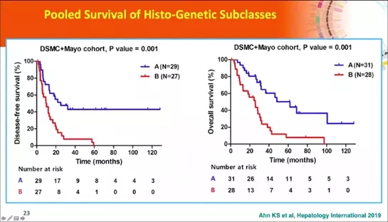 根据组织遗传学分型,可以将肝内胆管癌分为A、B两个亚型。对DSMC和Mayo两个队列进行研究发现,胆小管型肝内胆管癌主要分布于A亚型,而胆管型肝内胆管癌主要分布于B亚型,证明该分型方法支持组织病理学的分型结果。