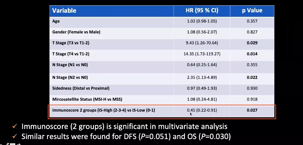 这些结果与在欧洲和北美患者中发现的相似。免疫评分高的Ⅰ~Ⅲ期结肠癌患者,其TTR更长,免疫评分或预测TTR、DFS、OS;多变量分析显示了同样的结果。