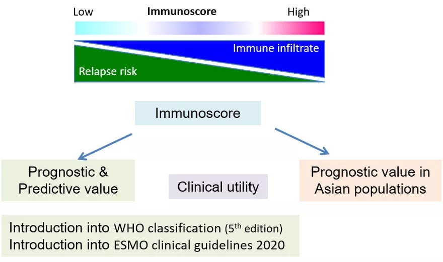 图5. 免疫评分的预后价值及其对化疗反应的预测价值已在多个已发表的研究中得到证实。在亚洲人群中,免疫评分也与复发时间和总生存率相关。免疫评分的临床效用已得到证实,免疫评分已被纳入WHO消化道肿瘤分类和2020年ESMO胃肠肿瘤临床指南,但还没有被纳入亚洲和日本的指南。