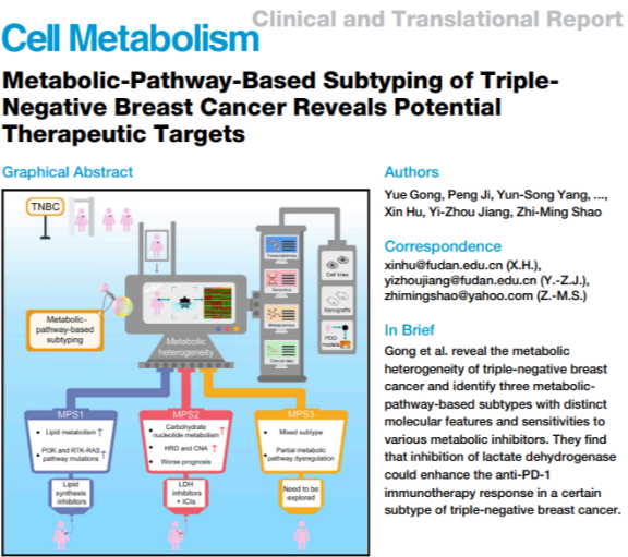 国际顶级学术期刊《细胞代谢》在11月12日凌晨刊发了这项成果。邵志敏教授表示,这项研究是国际上首次基于多维组学大数据、系统性地对三阴性乳腺癌的代谢特征进行的分析,从初步提出 “复旦四分型”,到临床实践探索,并总结既往经验,创新性的从代谢角度进一步定义和优化前述分型,揭示了三阴性乳腺癌的全新靶点,为三阴性乳腺癌患者尽早获得精准且有效治疗方案带来新希望。