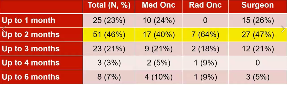该研究共有美国29个州的114名医生完成了调查,其中42名(37%)MO,14名(12%)RO,58名(51%)SO。大多数(N=73/96,76%)医生在NCI指定的综合癌症中心(N=48/94,52% )和大城市(N=49/94,52%)从事乳腺癌治疗。