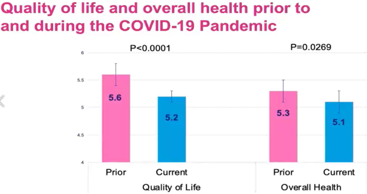 在2020年3月1日至2020年6月30日期间,对在纽约西奈山医院门诊中心接受护理的所有患者进行了34个问题的调查。在通过RedCap在线或在诊所通过打印版问卷接受调查的622名患者中,有211名(34%)完成调查。调查问题以李克特5点量表和EORTC QLQ-C30 QOL 7点量表回答。目前没有针对COVID的特定问卷,因此我们设计了几个原始问题。使用配对t检验评估大流行之前和结束时的平均QOL得分差异。