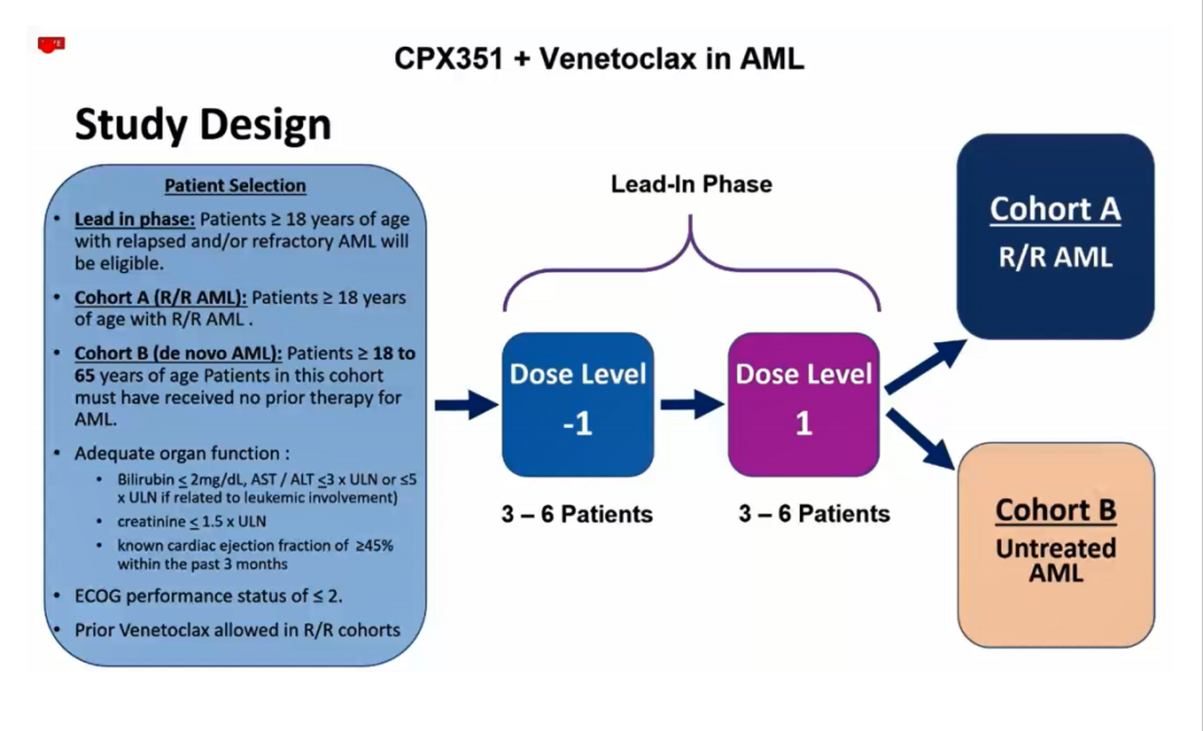 研究目的:本研究旨在探索维奈托克联合CPX-351对AML患者的安全性和疗效。