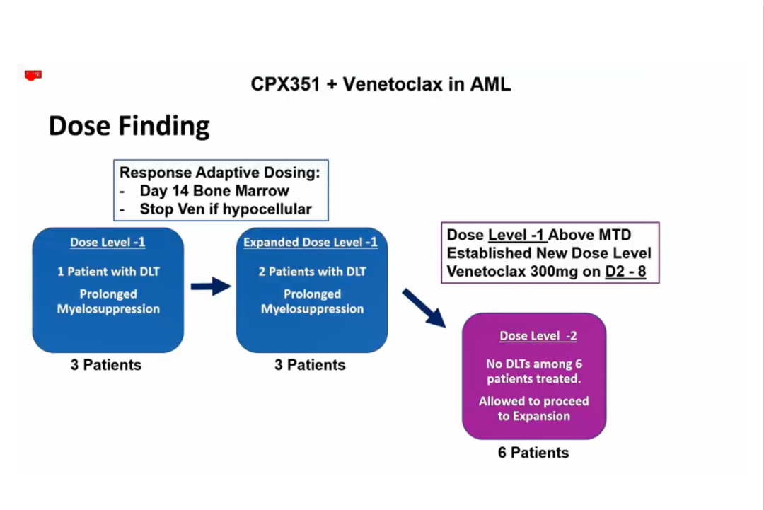 研究方法:在巩固治疗期间,CPX-351的剂量保持不变:在诱导第1、3、5天给予(柔红霉素44 mg/m2+ 阿扎胞苷100 mg/m2),在第1、3天给予(柔红霉素29 mg/m2 + araC药物 65 mg/m2)。由R/R AML患者组成的安全性导入队列在第2-21天接受的维奈托克起始有效剂量为300 mg(命名为-1剂量组)。如果在第14天的检查中骨髓(BM)细胞减少且无白血病证据,则允许在第14天后后中断维奈托克,合并使用中效和强效CYP3A抑制剂时并对维奈托克进行剂量调整。在3/6例患者出现DLT(血细胞减少 > 43天)时,被改为剂量-2组(维奈托克 300 mg,第2-8天)并扩展。确认安全性后,启动2个扩展队列以确认安全性和疗效;队列A用于复发、难治性 AML患者,队列B用于新诊断AML患者。