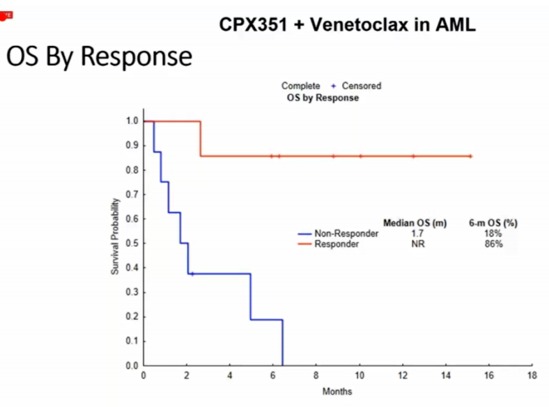 研究结论:对于复发、难治性AML患者中,CPX-351加7天维奈托克可耐受,毒性可接受。在该高风险AML队列中,CPX联合维奈托克表现出令人鼓舞的活性,尤其是在既往未接受维奈托克的患者中。几乎所有应答者均能够继续接受SCT。